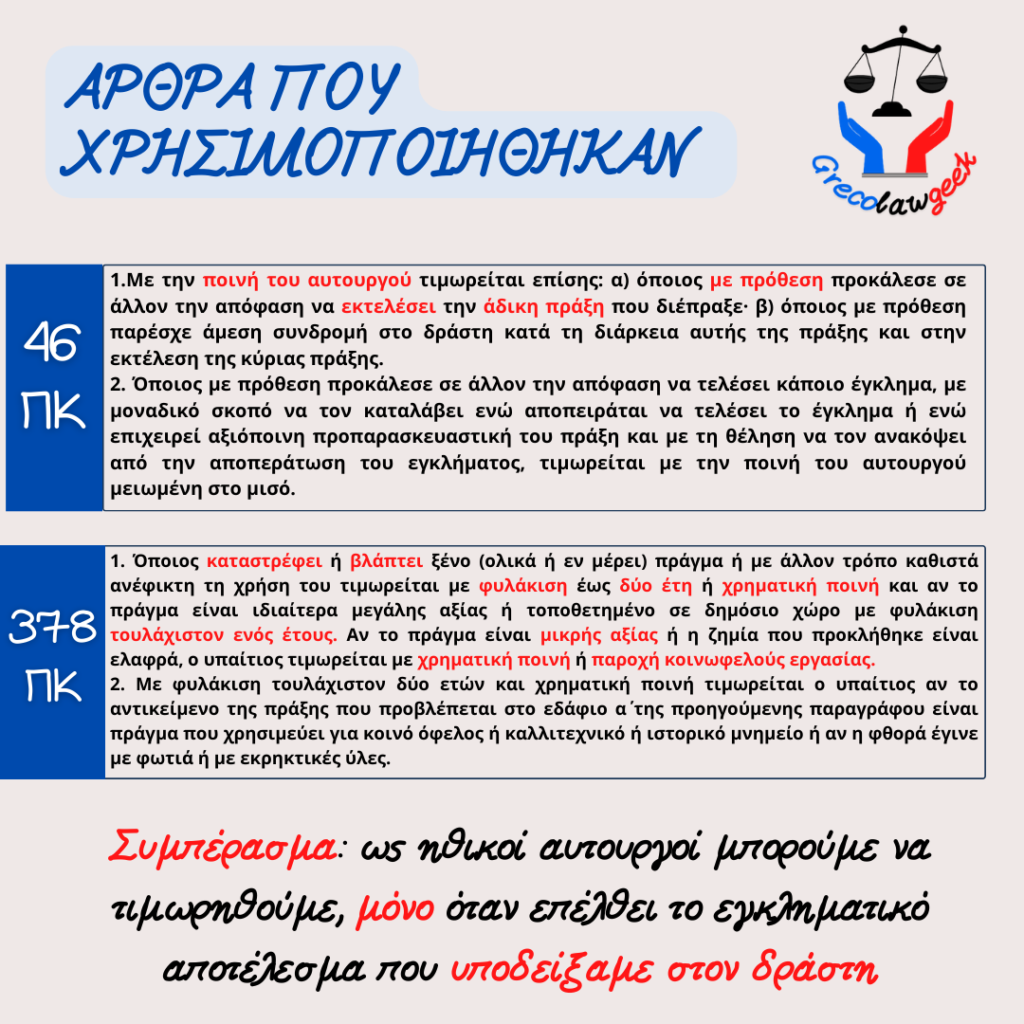 Home Blog "Στα βαθιά της ηθικής αυτουργίας"-Επεισόδιο 25 “Στα βαθιά της ηθικής αυτουργίας”-Επεισόδιο 25grecolawgeekSeptember 17, 2024Blog Welcome to your Στα "βαθιά" της ηθικής αυτουργίας Υφίσταται ηθική αυτουργία στη φθορά της ξένης ιδιοκτησίας της Μαρίας; ΝΑΙ ΟΧΙ Ανεξάρτητα από το προηγούμενο ερώτημα, θα μπορούσαμε να πούμε ότι τέλεσε και κάποια άλλη αξιόποινη πράξη; ΝΑΙ ΟΧΙ Time's up
